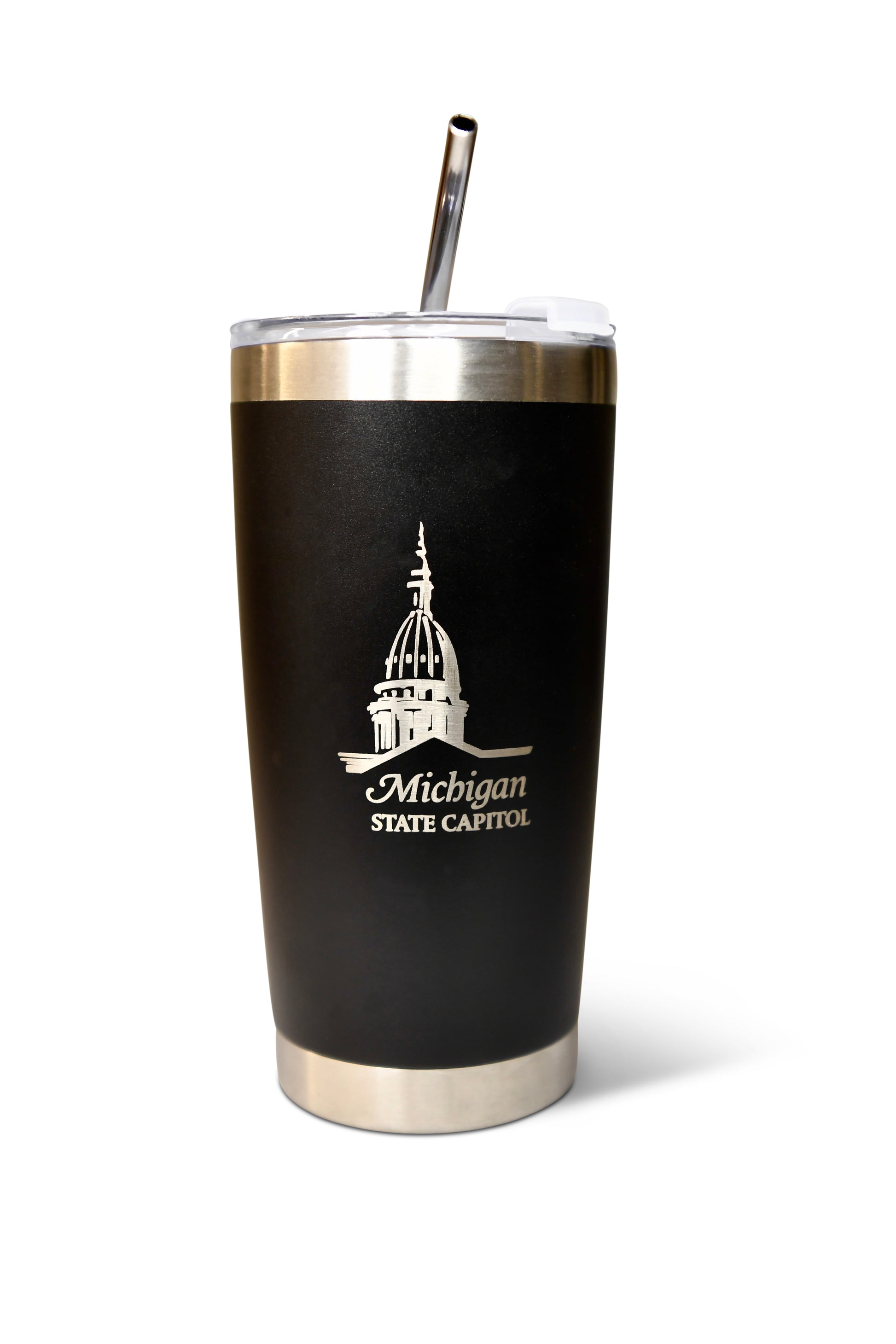 The Michigan State Capitol was one of the first state capitols to be topped by a lofty cast iron dome. The dome’s silhouette is laser etched on a black stainless-steel cup. Each comes with a plastic lid and stainless-steel straw.